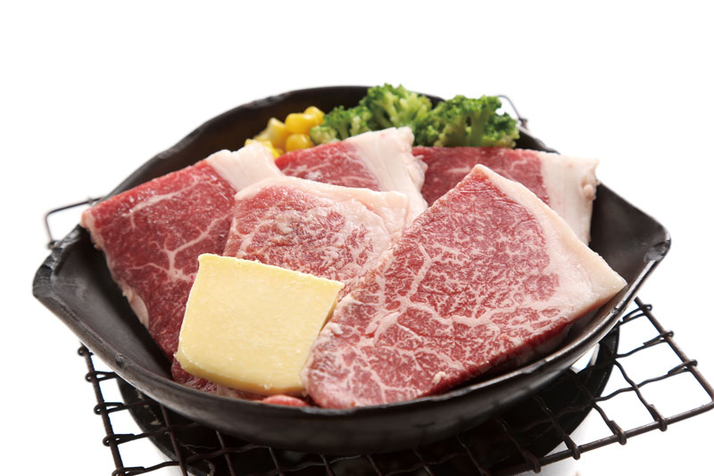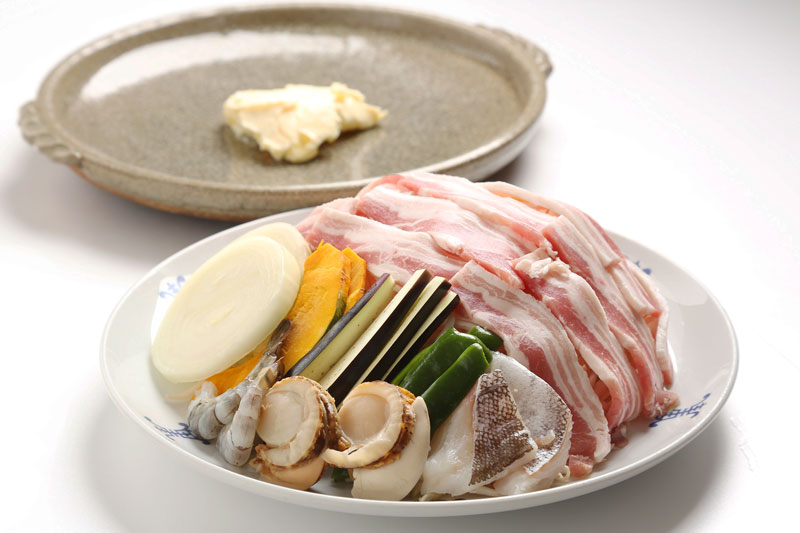 無塩マーガリン使用 陶板鍋にたっぷりのバターをひき、肉類、魚介類、野菜を順にいれて焼き、タレにて食す。